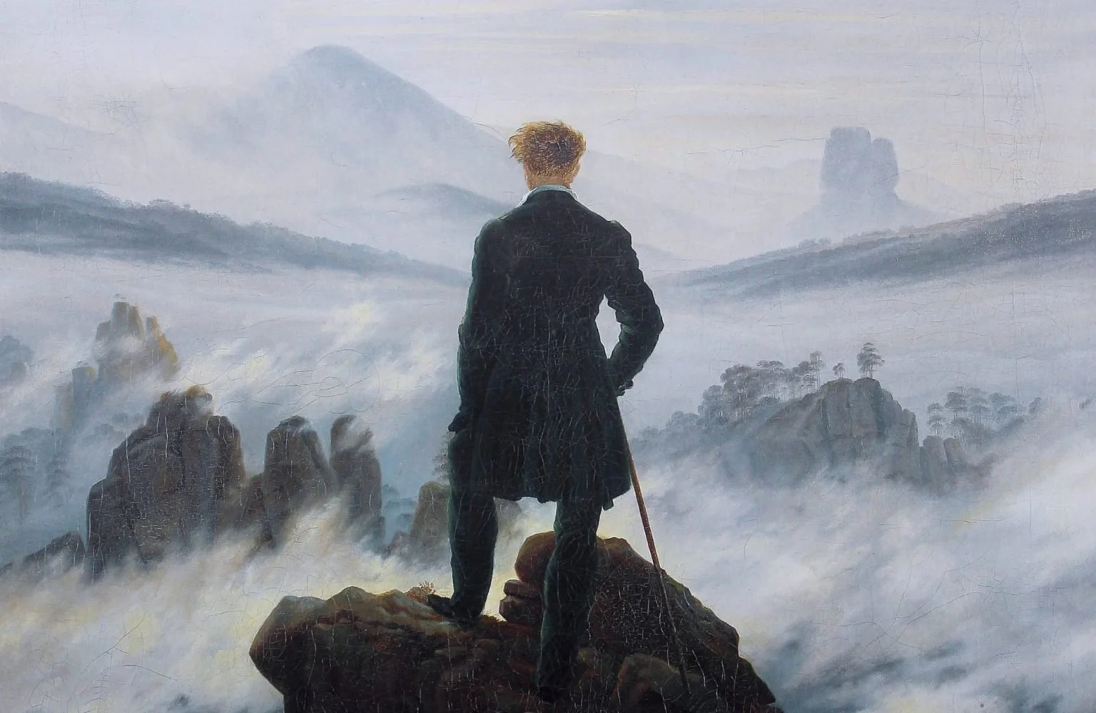 En ook kwam ik al mijmerend bij een werk van Caspar David Friedrich uit. Een Duitse schilder uit de Romantiek, een schilderstijl uit 19e eeuw, die de mens altijd klein neerzette tegenover een oneindige natuur. Zijn Wanderer über dem Nebelmeer – een man die uitkijkt over een zee van mist – laat precies datzelfde gevoel zien: klein zijn, verloren bijna, en tegelijk onderdeel van iets groters.